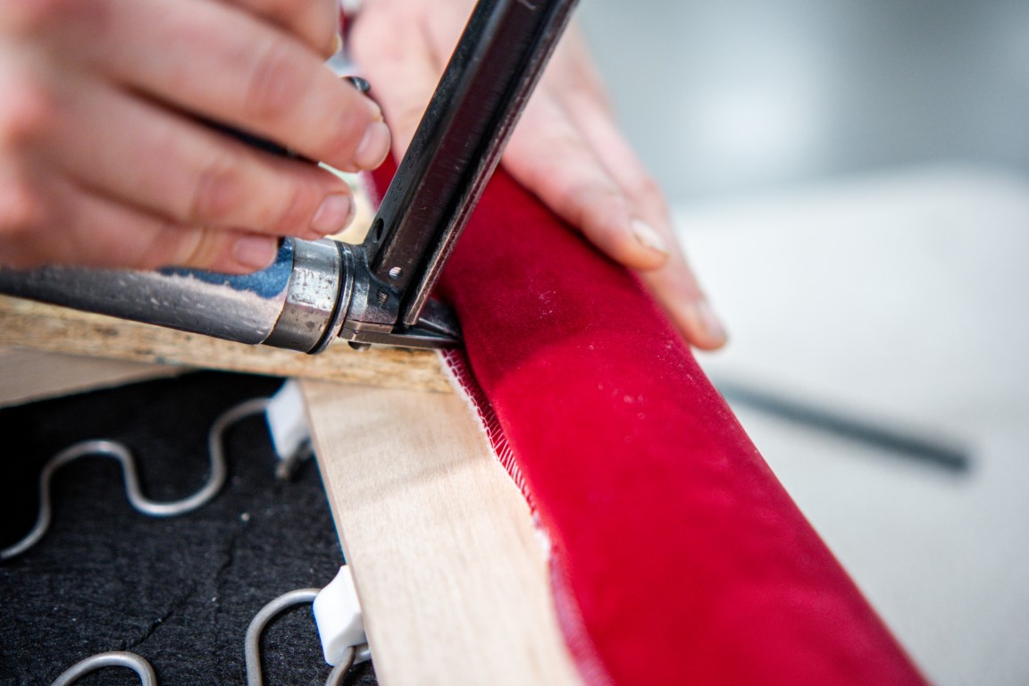 - Aplikácia rôznych textílií, koža alebo ušitých poťahov z textílií a kože na rôzne vopred pripravené povrchy za pomoci spôn, klinčekov, lepidla alebo špeciálnych profilov...